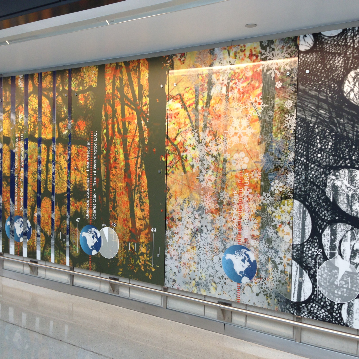 The installation explores how global and local time shape our perception of place. Through the lenticular flip effect, images transition between seasonal changes in Virginia’s hardwood forests and satellite views of the earth as it orbits the sun. These shifting compositions reveal a dialogue between natural cycles and the rhythms of international travel.